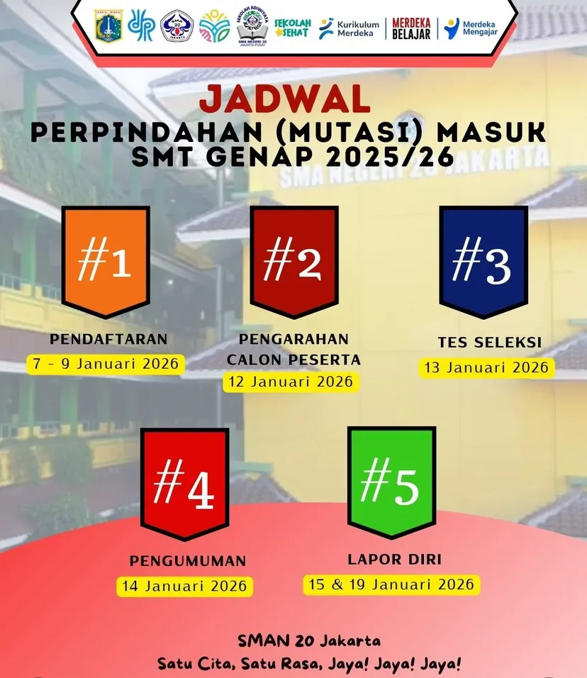 Daya Tampung dan Jadwal Perpindahan Masuk Murid Semester Genap TP. 2025/2026 SMA Negeri 20 Jakarta